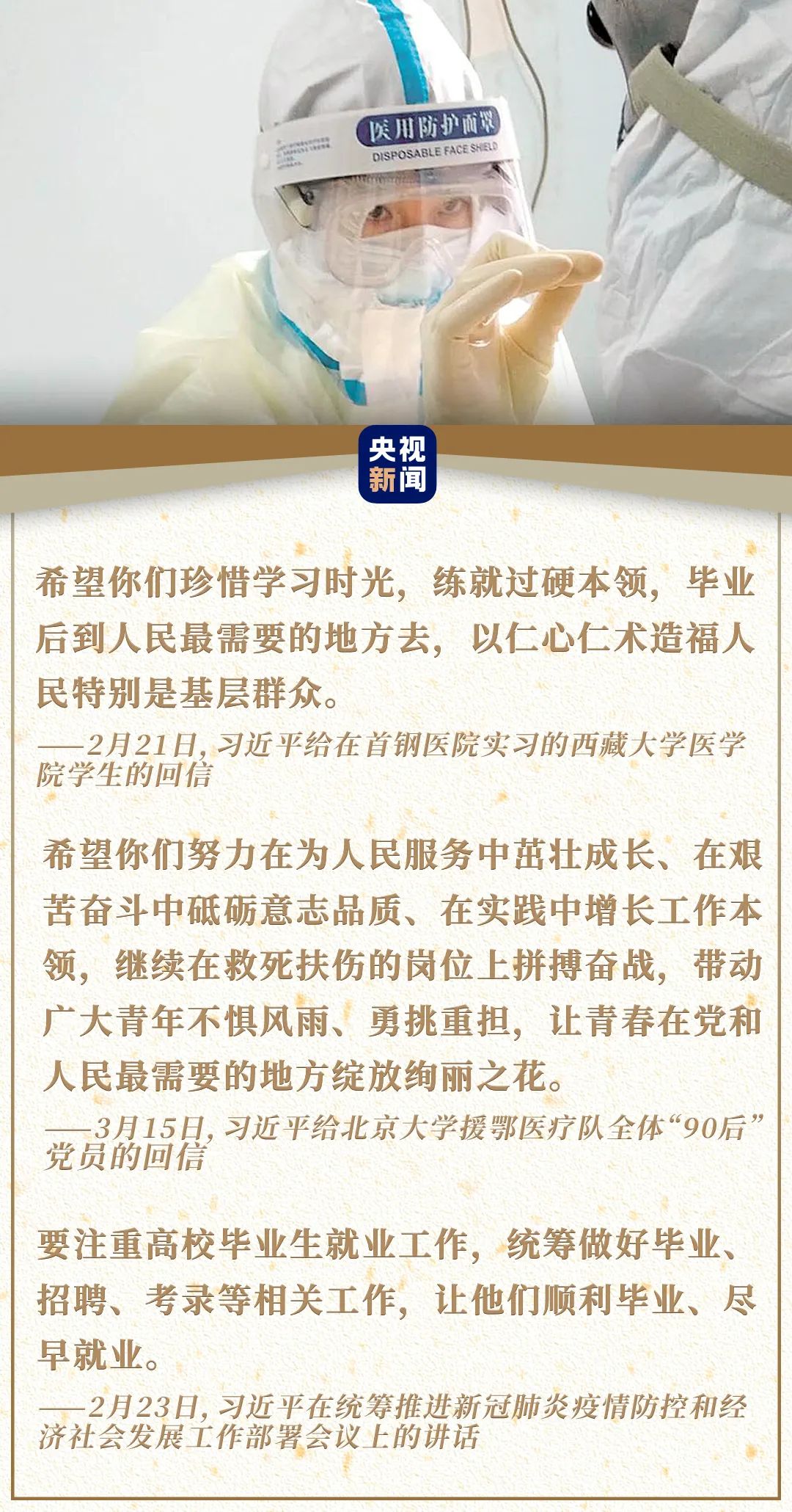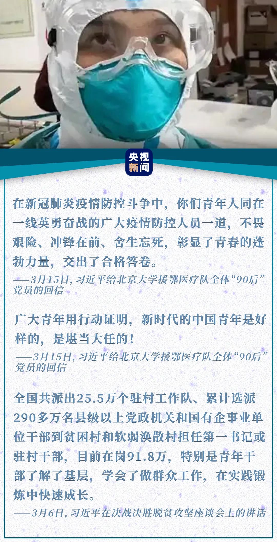 “在新冠肺炎疫情防控斗争中,你们青年人同在一线英勇奋战的广大疫情防控人员一道,不畏艰险、冲锋在前、舍生忘死,彰显了青春的蓬勃力量,交出了合格答卷。”