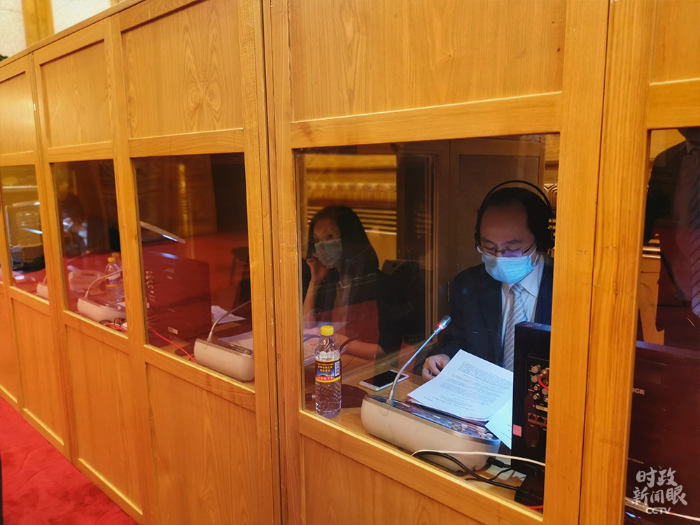 △大会堂里,同声传译人员在做准备工作。(总台央视记者李晓周拍摄)