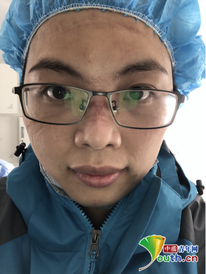 脱下厚重的防护设备后,黄春芬的脸颊、额头满是压痕。受访者供图