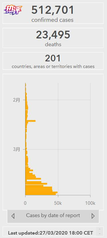 与此同时,境外疫情形势严峻。世卫组织实时统计数据显示,截至欧洲中部时间3月27日18时(北京时间3月28日1时),全球确诊新冠肺炎512701例,死亡23495例,目前全球已有201个国家地区出现新冠肺炎病例,中国以外新冠肺炎确诊约43万例。