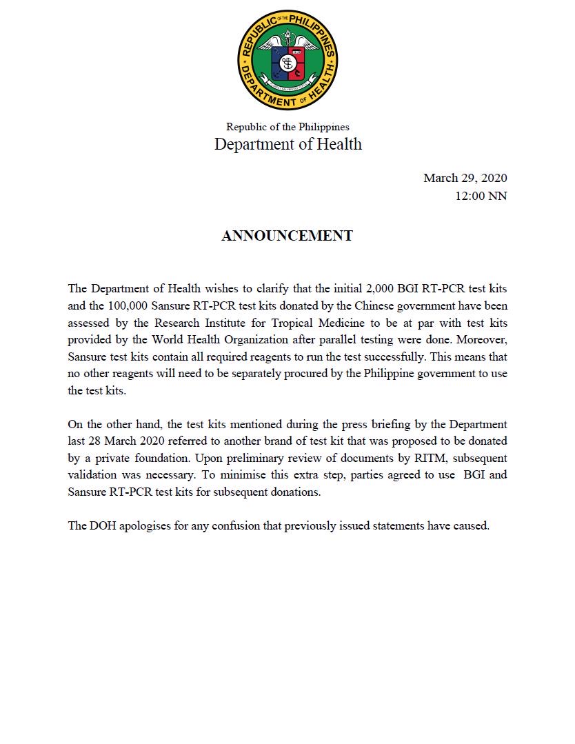 3月29日,菲律宾卫生部发布公告,对有关中国援菲新冠肺炎检测试剂质量的事宜作出澄清。
