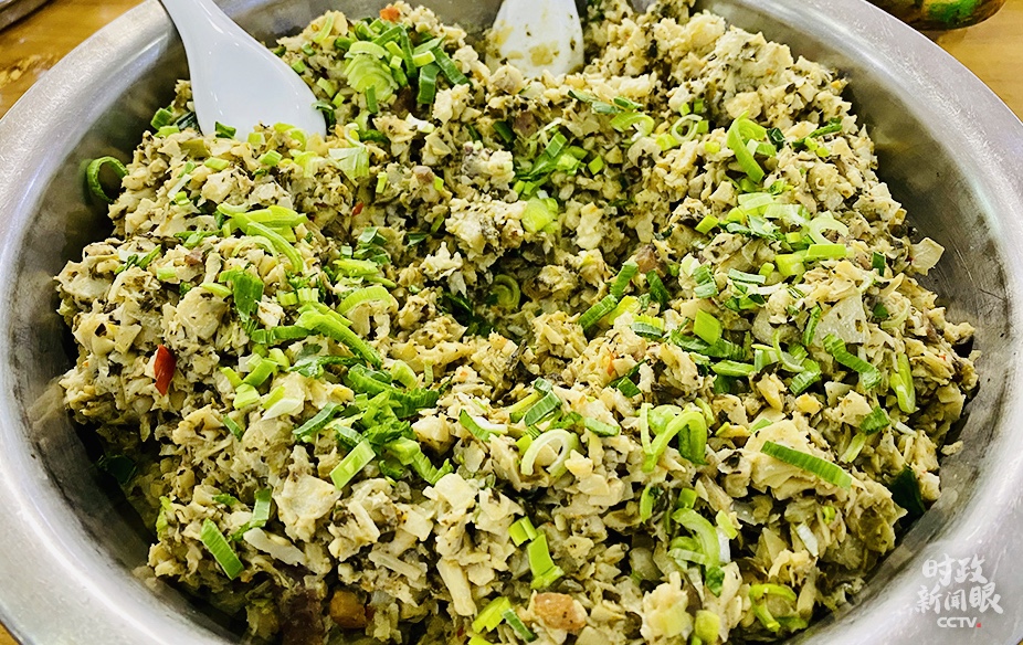 △雪里红、鲜笋和咸肉的组合,让青团咸香不腻。(总台央视记者李辉拍摄)