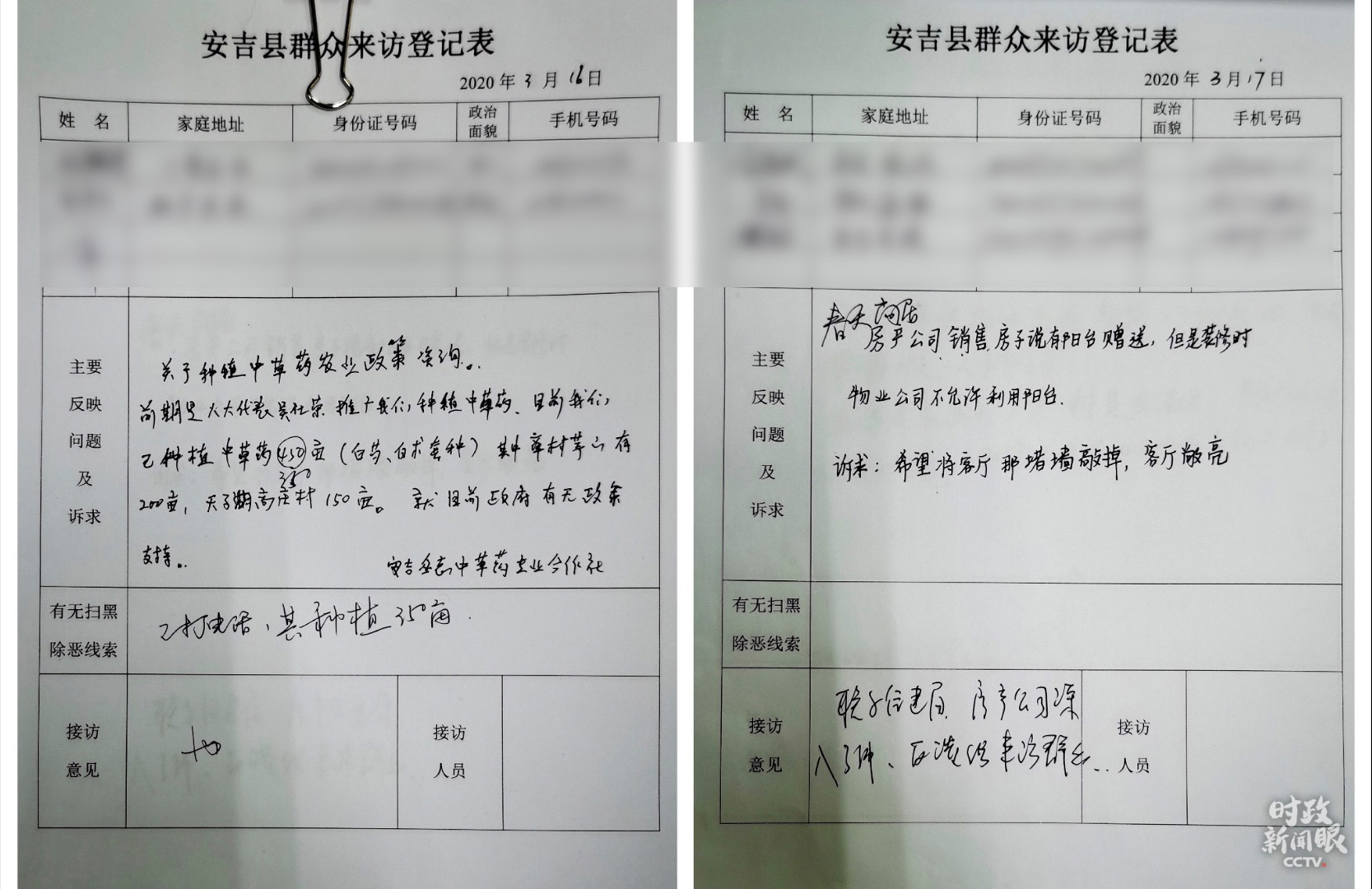 △在群众来访登记表中,能看到村民关于农药政策支持、房屋面积纠纷等问题诉求。(总台央视记者彭汉明拍摄)