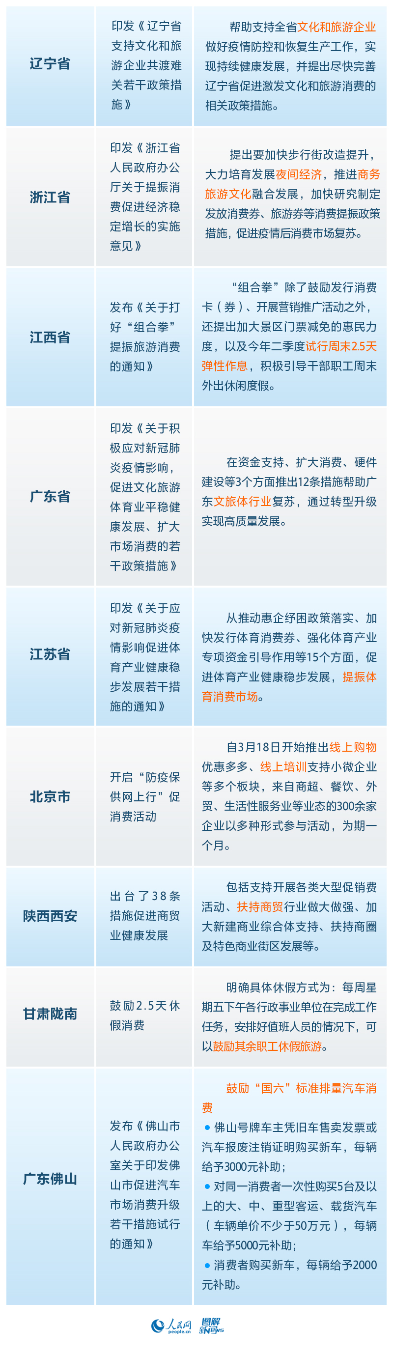自疫情发生以来,全国多省区市已经在因地制宜、因时制宜地出台文件和实施办法来应对疫情带来的冲击。2月13日,北京市人力资源和社会保障局新闻发言人介绍了北京市出台的系列援企稳岗政策;2月17日,江苏省出台《关于疫情防控期间稳就业保用工的工作措施》;2月20日,广东省印发《广东省进一步稳定和促进就业若干政策措施》;3月13日,合肥市出台《合肥市疫情防控期间稳就业相关政策实施细则》;3月17日,贵州省印发《促进2020年高校毕业生就业创业十条措施》;3月27日,湖北省政府办公厅印发《关于应对新冠肺炎疫情影响全力以赴做好稳就业工作的若干措施》……此外,各地也因地制宜,出台新政提振消费。从推进融合到扶持特色商圈,从鼓励休假消费到给予购车补贴,多渠道发力,推动经济复苏。