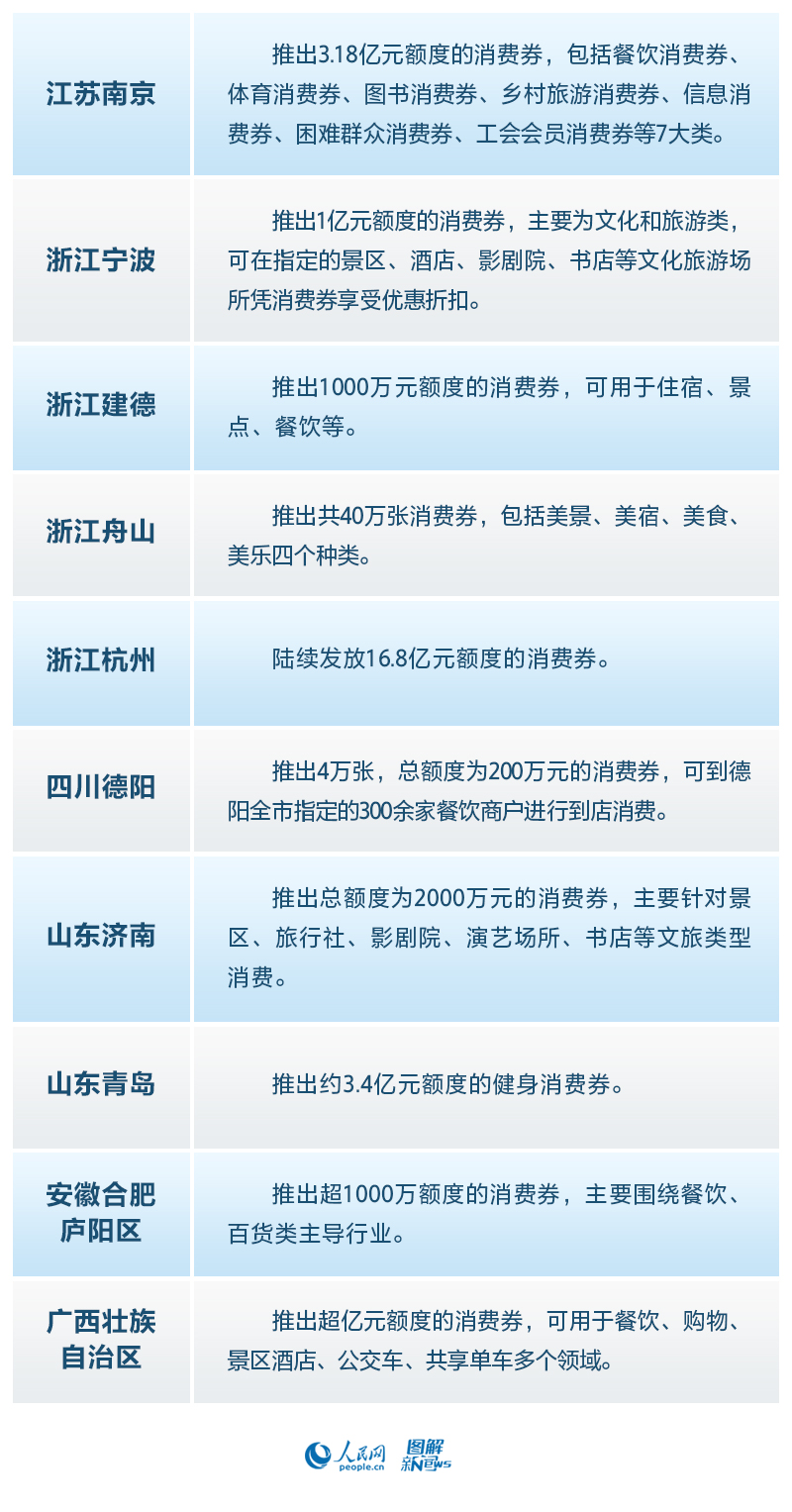 近期,南京、宁波、济南等地纷纷推出消费券,额度从几百万元至上亿元不等,涉及餐饮、住宿、健身、文化等多个领域。据了解,南京发放消费券在5天内带动近千万元消费,杭州发放第一批消费券即拉动消费4.53亿。目前,多省市已推出或计划推出消费券。