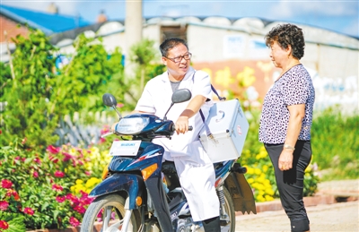 望奎县海丰镇八方村的村医冯光辉巡诊途中询问贫困户身体情况。刘心杨摄/光明图片