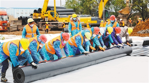 中建三局火神山医院建设者在施工现场铺设“两布一膜”防护层。 (资料照片)