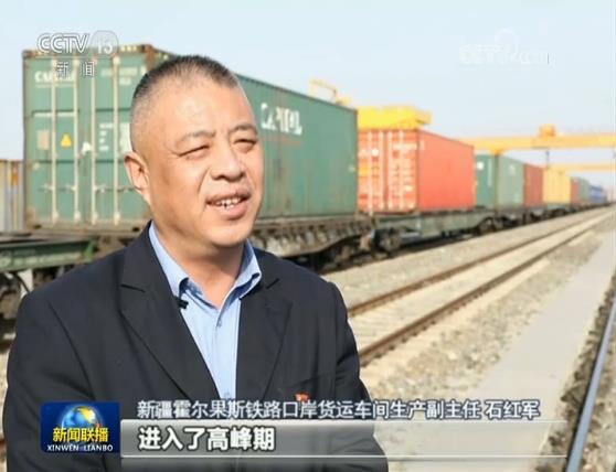 新疆霍尔果斯铁路口岸货运车间生产副主任 石红军:随着疫情不断好转,内地企业复工复产后,经我们霍尔果斯进出口的班列进入到高峰期;目前,我们日均进出中亚、中欧班列可达到15列,高峰期时可达到16至17列。
