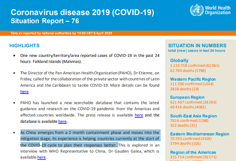 当地时间4月5日,世界卫生组织官网发布第76期新冠肺炎疫情报告。报告中提到,中国在经过两个月的抗疫奋战后,已经由“遏制阶段”走向“缓疫阶段”,中国的经验正在帮助其他处于抗疫初期的国家,使他们可以更好地制定应对疫情的措施。