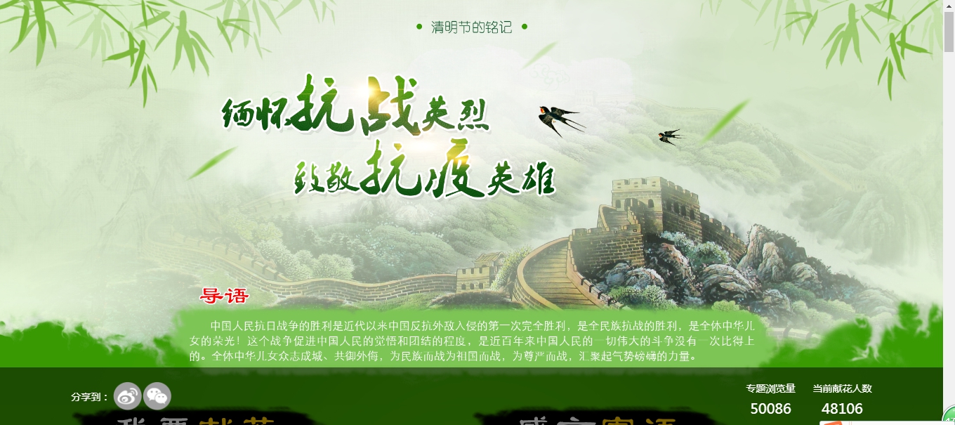 4月3日,北京民俗博物馆通过线上发布《抗击疫情 携手同行》抗疫视频,向观众介绍博物馆抗击疫情的相关工作情况,同时通过宣传清明传统习俗知识,倡导清明缅怀英烈、绿色祭扫。中国人民抗日战争纪念馆启动“清明节的铭记——缅怀抗战英烈 致敬抗疫英雄”主题教育系列活动,包括清明专场云直播、线上研学、京冀互动“雄安人民的骄傲”等,其中清明专场云直播共计有6.1万名观众参与。抗战馆还在官网推出“缅怀抗战英烈 致敬抗疫英雄”清明节特别专题页面,展示抗战英烈名录、英烈故事、英烈家书、抗疫英雄视频、抗疫诗歌及抗战馆清明节相关活动,呼吁大家通过“云献花”、网上留言等方式参与“云祭扫”。4月2日至4月6日10时,专题页面浏览量、献花人数分别为4.8万、4.6万。