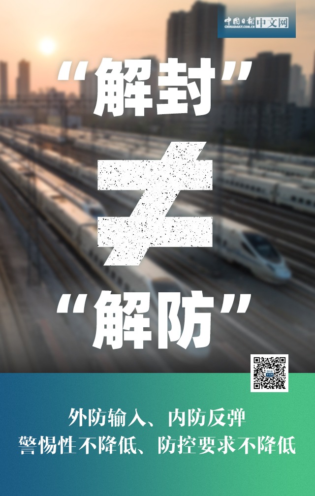 但“解封”不等于“解防”,打开城门不等于打开家门,零新增并不等于零风险。目前疫情防控任务依然艰巨繁重,尤其境外疫情输入压力持续增大,我们不能盲目乐观。疫情之下,让我们继续加强自我管理,不扎堆,不聚集,保持人员安全有序流动。