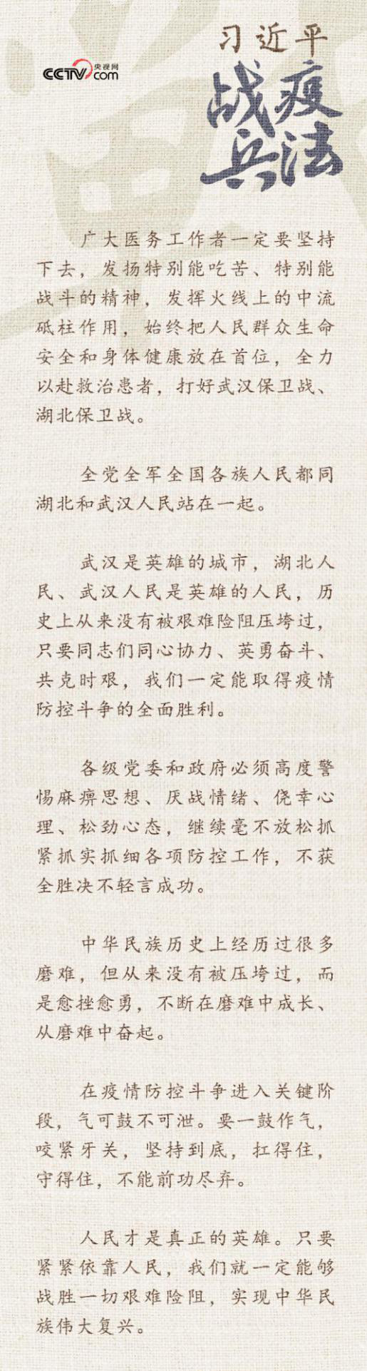 “战胜这次疫情,给我们力量和信心的是中国人民。”“人民才是真正的英雄。只要紧紧依靠人民,我们就一定能够战胜一切艰难险阻,实现中华民族伟大复兴。”