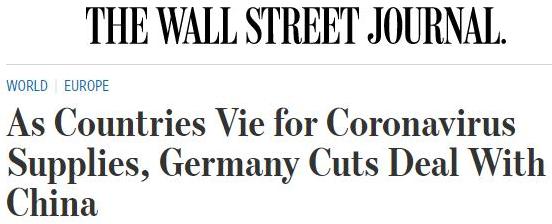 △在各国争夺防疫用品之际,德国与中国签订了决定性协议(图片来源:《华尔街日报》)