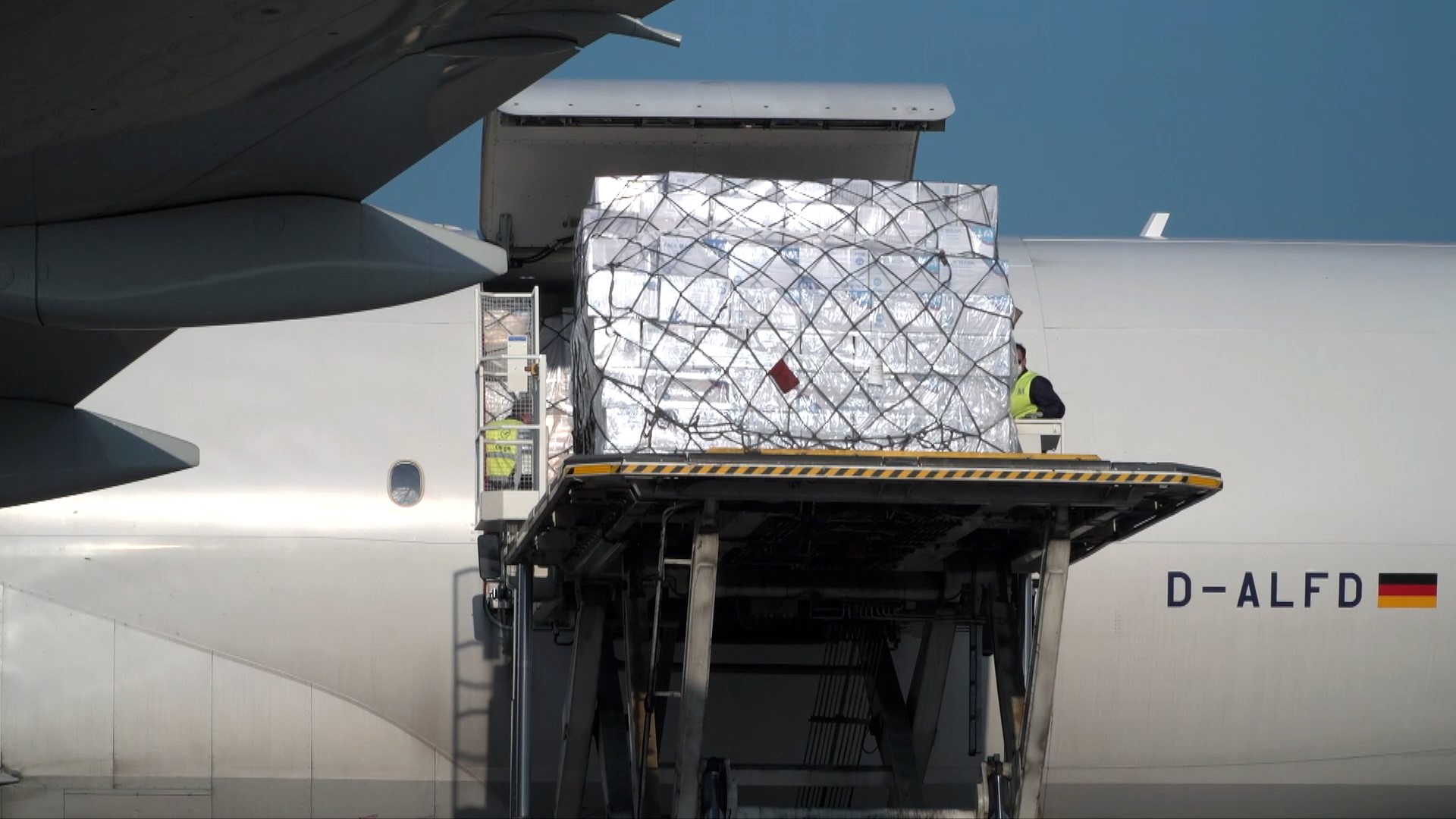 △德国汉莎航空运送的一批800万只中国口罩运抵慕尼黑机场(图片来源:CGTN)