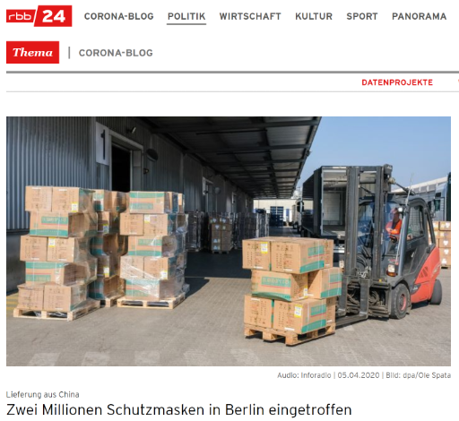 △来自中国的交货 200万件防护口罩抵达德国柏林(图片来源:德国rbb官网)