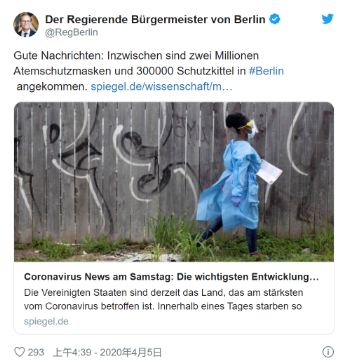 德国参议院发言人Melanie Reinsch5日上午表示,这批货物由德国联邦国防军送至柏林。柏林市长迈克尔·穆勒(Michael Müller)也在其个人社交账号上表示这是一个“好消息”。