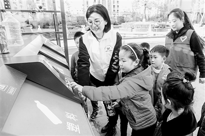 2020年4月6日,浙江省长兴县太湖街道新溪社区青年志愿者正在向孩子们模拟使用智能分类垃圾桶投放垃圾。吴 拯摄/光明图片