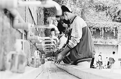 2020年4月7日,四川省返校学生在饭前用七步洗手法进行消毒。蒋永平摄/光明图片