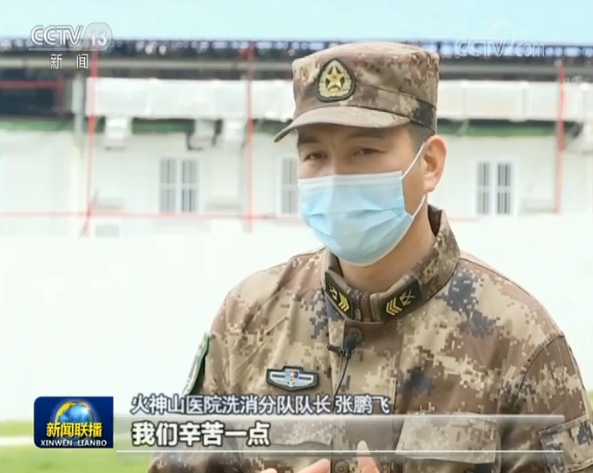 火神山医院洗消分队队长 张鹏飞:到目前这个阶段我们火神山医院基本上属于决战期了,后期了,要保证始终是那么旺盛的战斗力,为咱们医务人员守好这个钢铁防线。