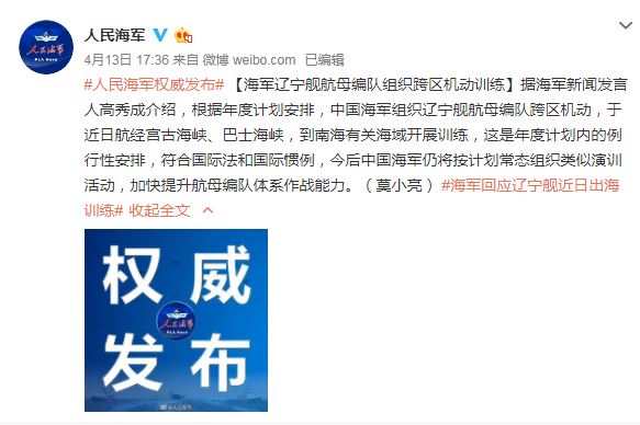 中国台湾网4月14日北京讯 4月13日,据海军新闻发言人高秀成介绍,根据年度计划安排,中国海军组织辽宁舰航母编队跨区机动,于近日航经宫古海峡、巴士海峡,到南海有关海域开展训练,这是年度计划内的例行性安排,符合国际法和国际惯例,今后中国海军仍将按计划常态组织类似演训活动,加快提升航母编队体系作战能力。(完)
