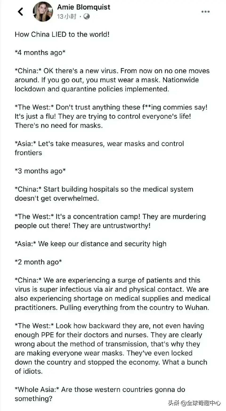 “准确。疫情暴发之初我在中国,后来1月底去了欧洲。每次看到他们在电视上讨论‘群体免疫’,我都会尖叫。”通过这次疫情,网友Barrie Vesty看得很透彻,“任何事都可以拿来给这个国家贴标签。”