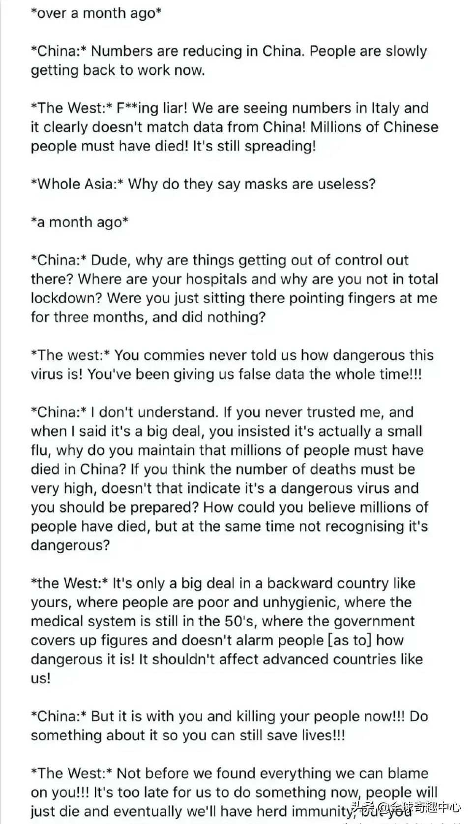 中国:你从来不相信我,不是吗?当我说这是一个大问题时,你坚持称这只是一个小流感。你为什么认定中国有数以百万计的人死了?如果你这么认为,这不正意味着它是一种高度危险的病毒?而你,早该做好准备!你怎么能一边相信我这儿死了那么多人的同时,却又认识不到病毒的危险?