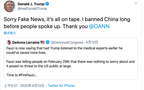 特朗普也立刻转发了这条带有#解雇福奇#话题的推特,并评论:“不好意思,假新闻们,这些都有据可查,我很早就对中国下了旅行禁令了 ”,以此证明自己并没有延误疫情应对的时机。