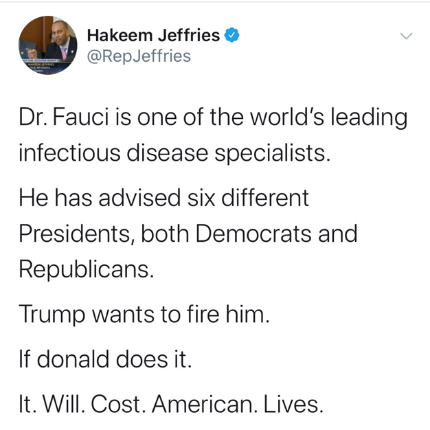 有人愤慨地表示:“福奇博士是世界最优秀的传染病专家之一,他给六位总统做过顾问,民主党和共和党的都有,而特朗普想要炒掉他。如果特朗普真这样干,那付出的是美国人生命的代价。”↓↓
