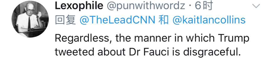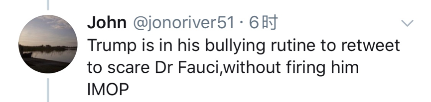 “特朗普又开始了他的霸凌行为,他转发这个话题就是想震慑福奇博士,又不开除他。”↓↓