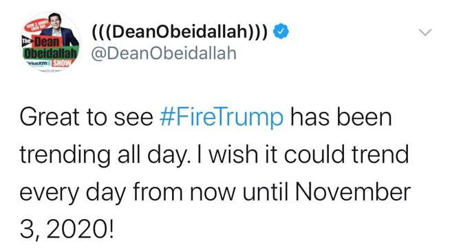 有网民表示:“很高兴看到#解雇特朗普#话题上了一整天的热搜,我希望它保持热度,直到今年11月3日(美国总统大选日)!”↓↓