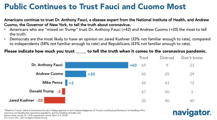 美国民调机构“领航员”(Navigator)4月10日发布的调查结果显示,美国人在疫情中更信任福奇而非特朗普,在这份调查中,福奇以60分排名第一,特朗普只得到-3分,倒数第二。垫底的则是特朗普的女婿贾里德·库什纳。