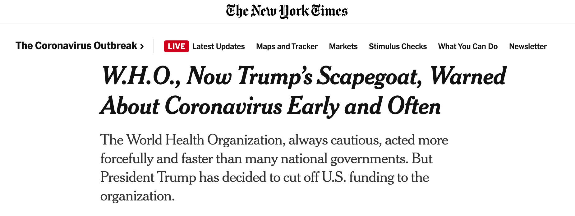 16日,《纽约时报》发文称:世卫组织是特朗普寻找的“替罪羊”,该组织向来谨慎,其行动比许多国家政府更有力、更快速。