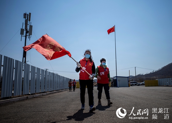 张鸿博举着“绥芬河市青年志愿者突击队”的旗帜。
