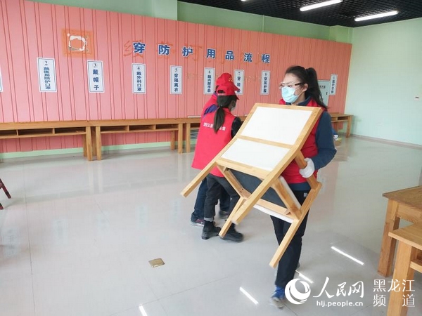 张鸿博正在绥芬河方舱医院的防护服更衣室内搬运椅子。