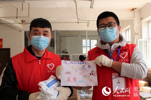 4月15日10点,张鸿博的“同事”——绥芬河市的青年志愿者刘晓亮(右)和赵世涛(左)打开一箱未写有寄件人的援助物资,惊喜地发现一张手绘画,上面写着“战胜疫情,黑龙江人是最棒的!”