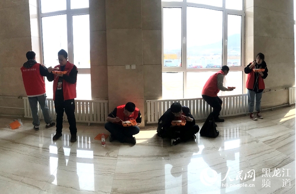 忙起来的志愿者们只能站着吃盒饭。