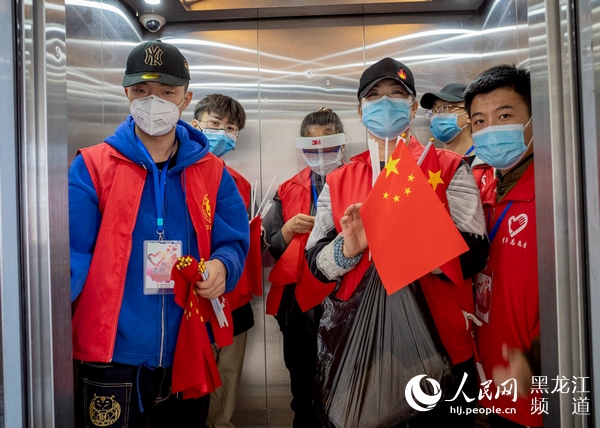 绥芬河方舱医院内志愿者们正准备布置国旗。