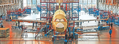 3月6日,工人在中国商飞上海飞机制造有限公司的生产车间内作业。