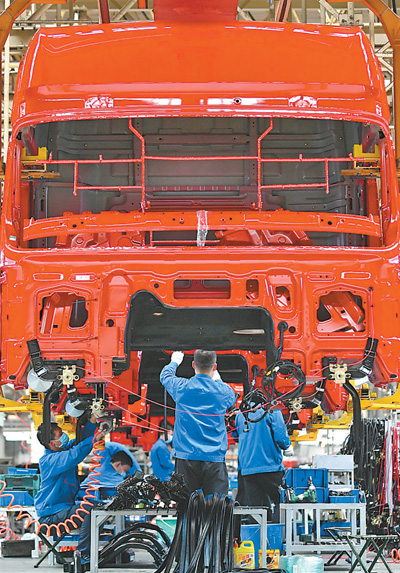 4月23日,工人在陕西汽车控股集团有限公司重卡总装线工作。
