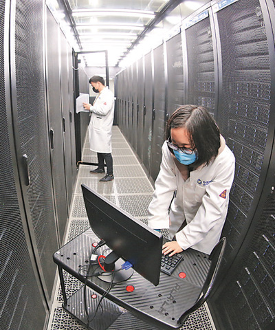 3月24日,中国移动(襄阳)数据中心,网络工程师在新型绿色仓储式数据中心进行网络调试。