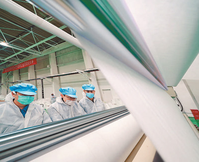 4月23日,燕山石化工人正在熔喷无纺布生产线上工作,该生产线仅用时12天就建成投产。