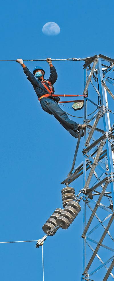 4月4日,在安徽省亳州市谯城区,国网亳州供电公司电力工人正在架设输电线路。