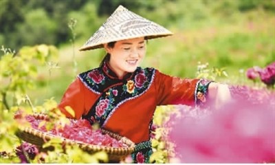 5月3日,村民在贵州省铜仁市松桃苗族自治县黄板镇腊冲村玫瑰产业园采收玫瑰花。 龙元彬摄