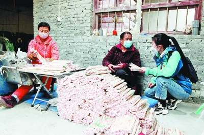 ①河南博爱县月山镇皂角树村第一书记贺颖颖(右一)在村里的一次性筷子厂了解贫困户近况。程全摄