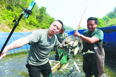 ②江西宜春市上高县翰堂镇江边村渔业产业扶贫基地,第一书记杨伟(左一)在直播销售鲈鱼。周亮摄