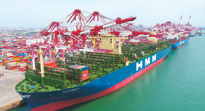 4月26日,载箱量2.4万标准箱的全球首艘最大集装箱班轮——THE联盟“HMM阿尔赫西拉斯”轮首航仪式在山东港口青岛港举行,标志着山东港口集装箱业务迈入2.4万标准箱“大船时代”。