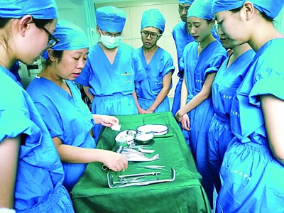 手术的顺利进展离不开器械护士的准确传递。图为北京大学护理学院学生正在老师引导下认识手术器械。李珂摄/光明图片