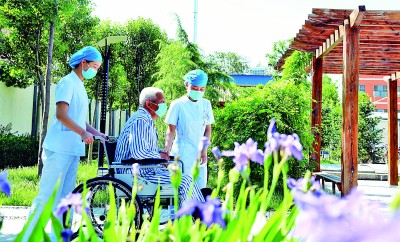 河北省邢台市桥东区医院护士在院区陪伴患者。新华社发
