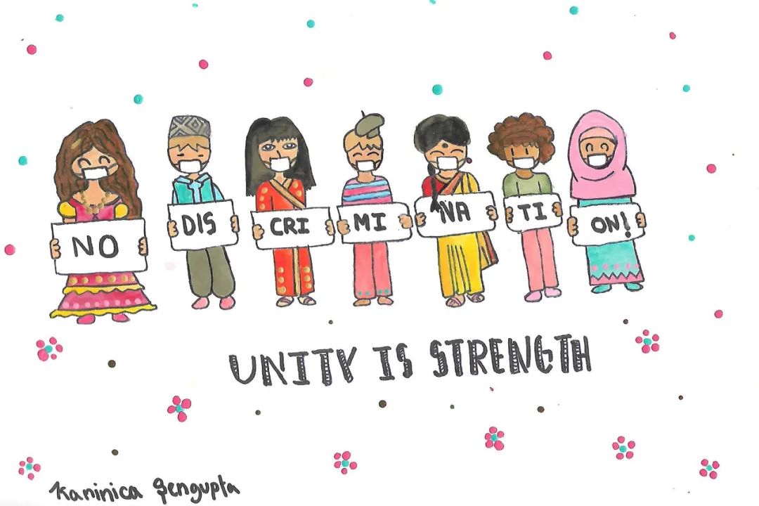 儿基会图片丨来自印度的12岁女孩卡尼妮卡绘制的画作,呼吁杜绝歧视,团结抗疫