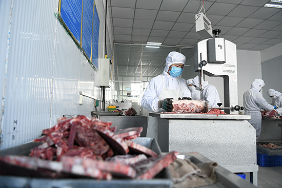 扎鲁特旗玛拉沁艾力食品有限公司工人正在切割牛排(陈立庚 摄)